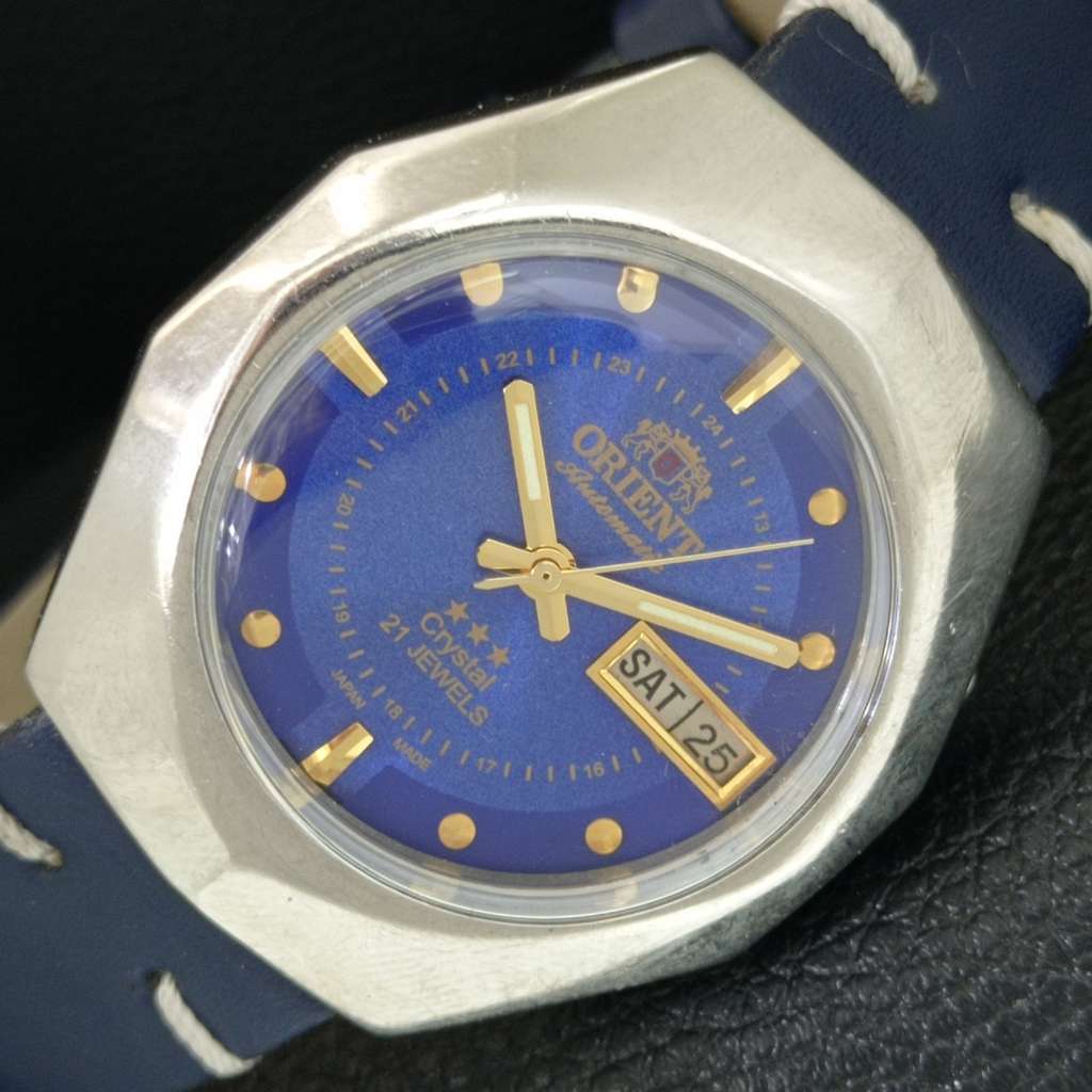AUTOMATIC VINTAGE ORIENT CRYSTAL 46943 JAPAN MENS BLUE DIAL WATCH a706900-1