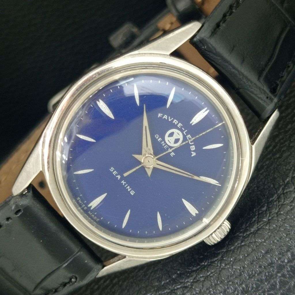 HAND-WINDING VINTAGE FAVRE LEUBA SEA KING SWISS MENS BLUE DIAL WATCH a703822-1
