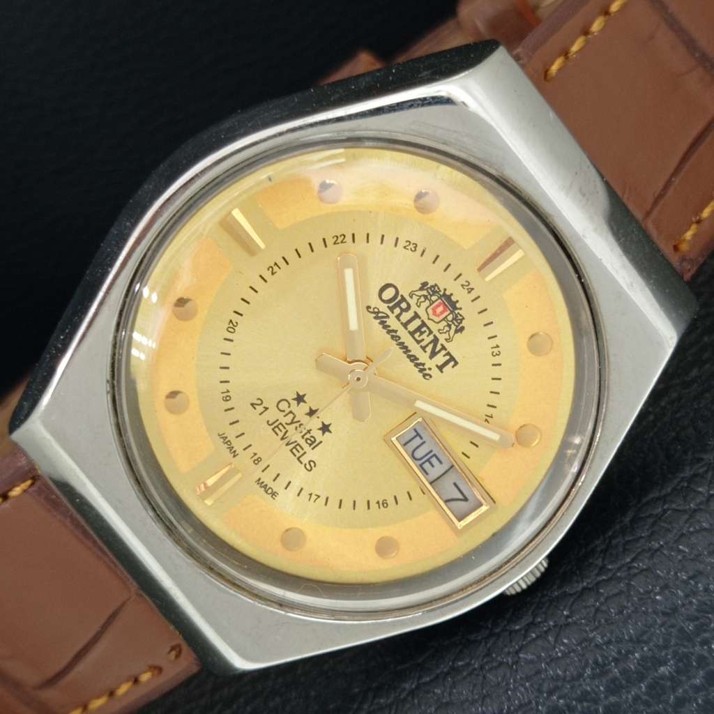 JAPAN VINTAGE ORIENT CRYSTAL 46941 AUTOMATIC MENS GOLDEN DIAL WATCH a706888-1