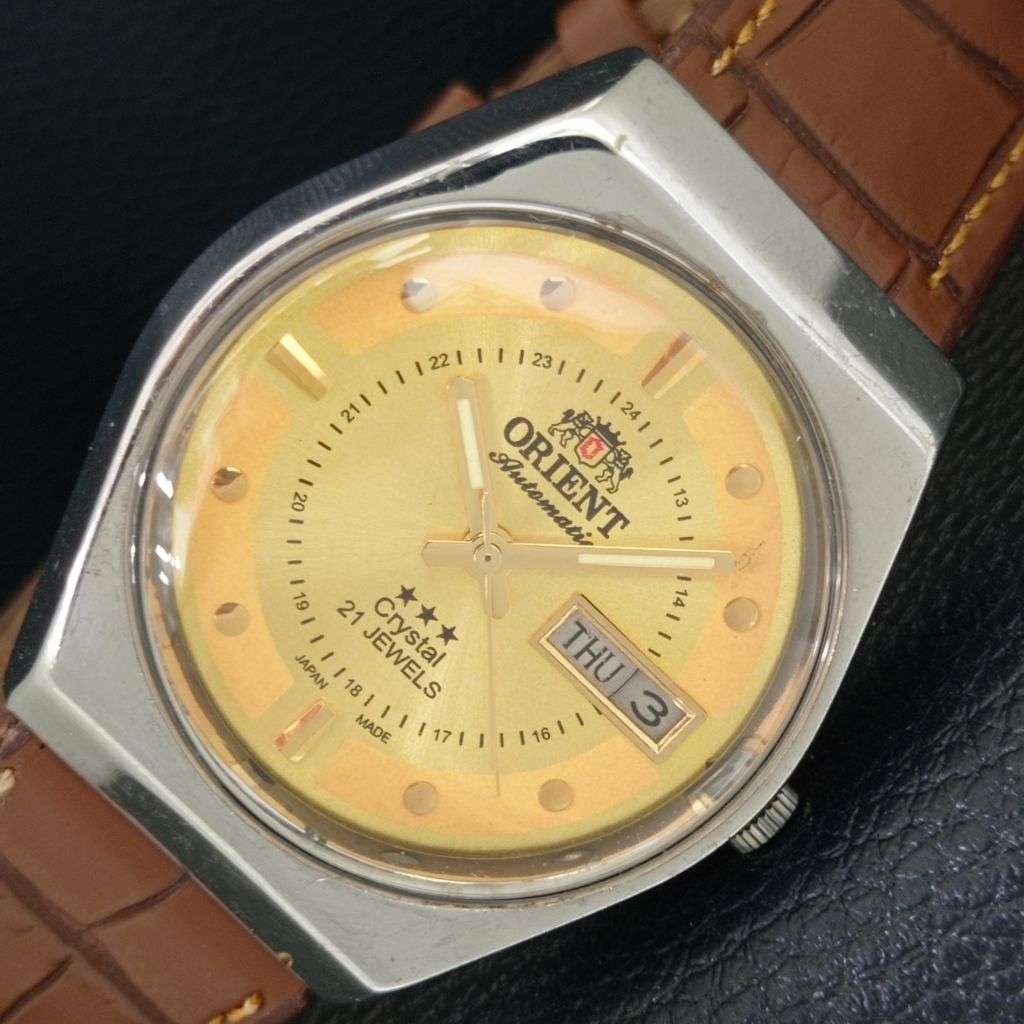 JAPAN VINTAGE ORIENT CRYSTAL 46941 AUTOMATIC MENS GOLDEN DIAL WATCH a706896-1