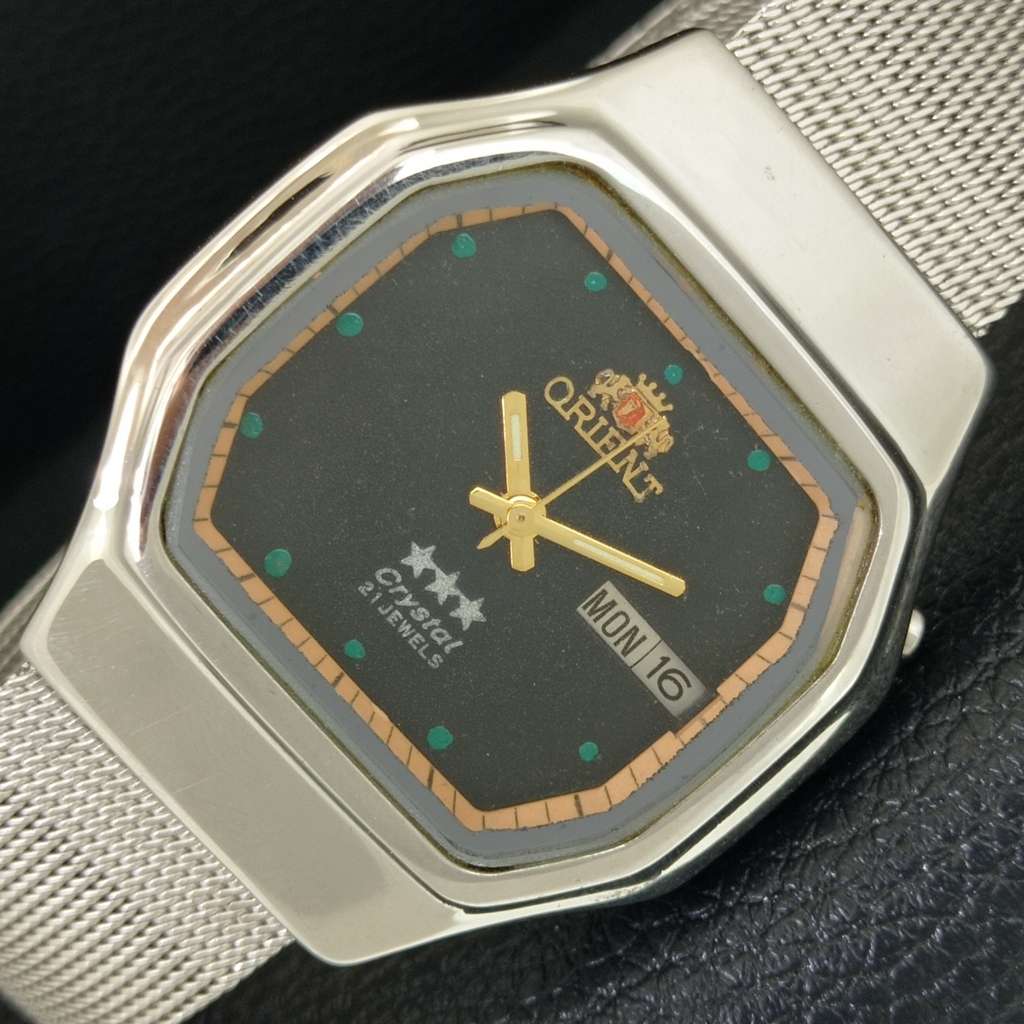 JAPAN VINTAGE ORIENT CRYSTAL AUTOMATIC 46943 MENS BLACK DIAL WATCH a704846-1