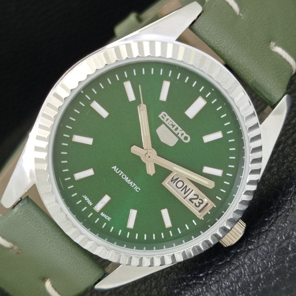 MENS VINTAGE REFURBISHED SEIKO 5 AUTOMATIC JAPAN GREEN DIAL WATCH a440593-1