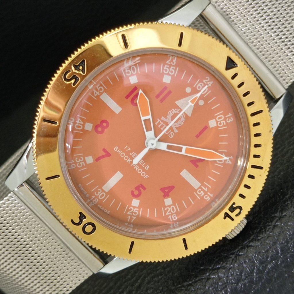 SWISS VINTAGE TITUS HAND-WINDING MENS TURNABLE BEZEL ORANGE DIAL WATCH a700009-1