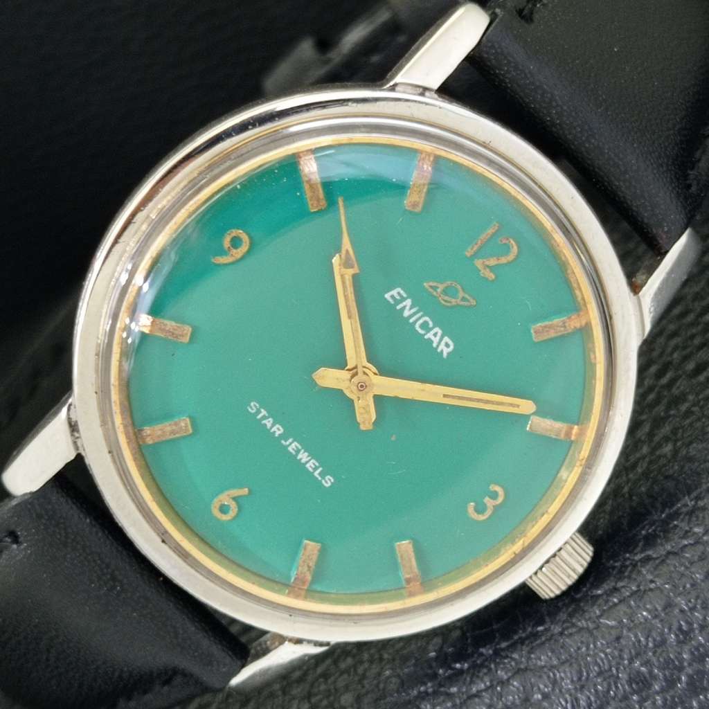 VINTAGE ENICAR STAR JEWELS HAND-WINDING 1140 SWISS MENS GREEN WATCH a702041-1