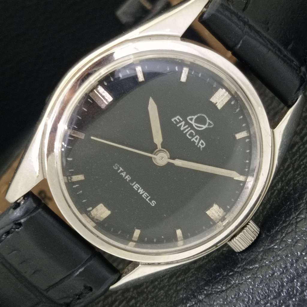 VINTAGE ENICAR STAR JEWELS HAND-WINDING SWISS MENS BLACK DIAL WATCH a703778-1
